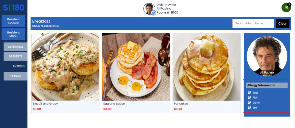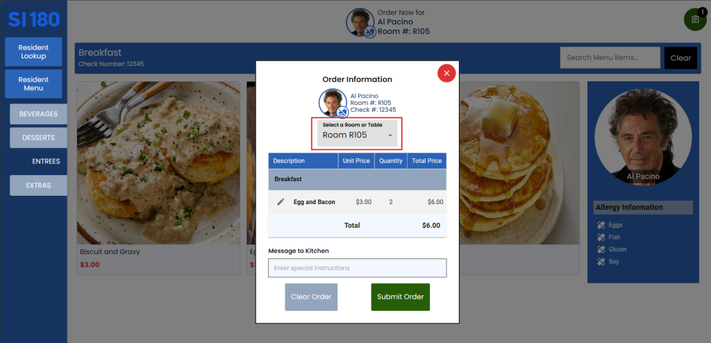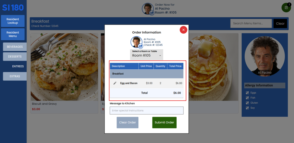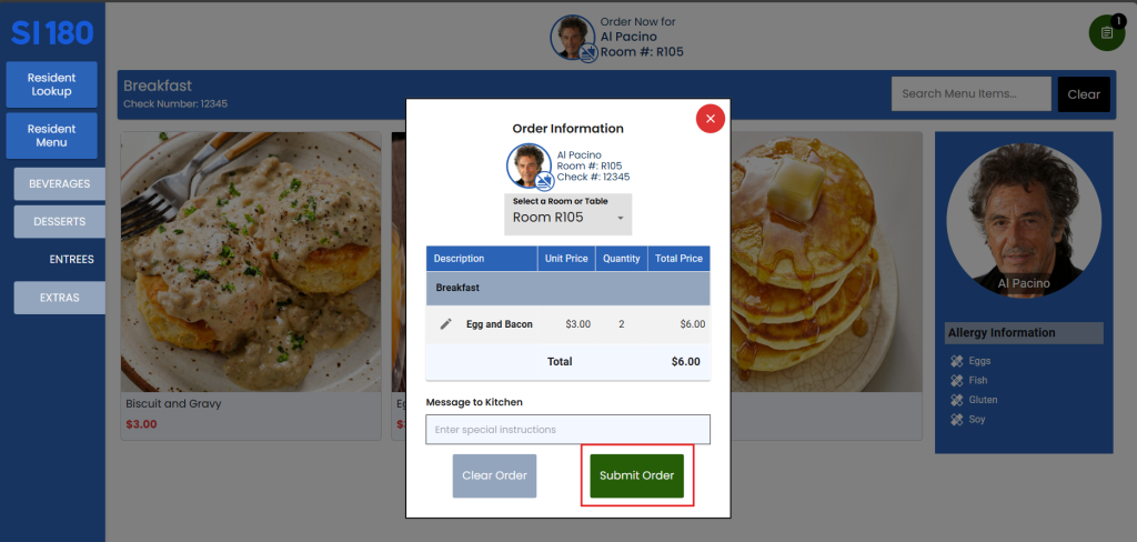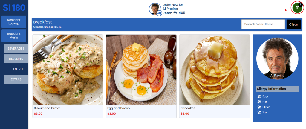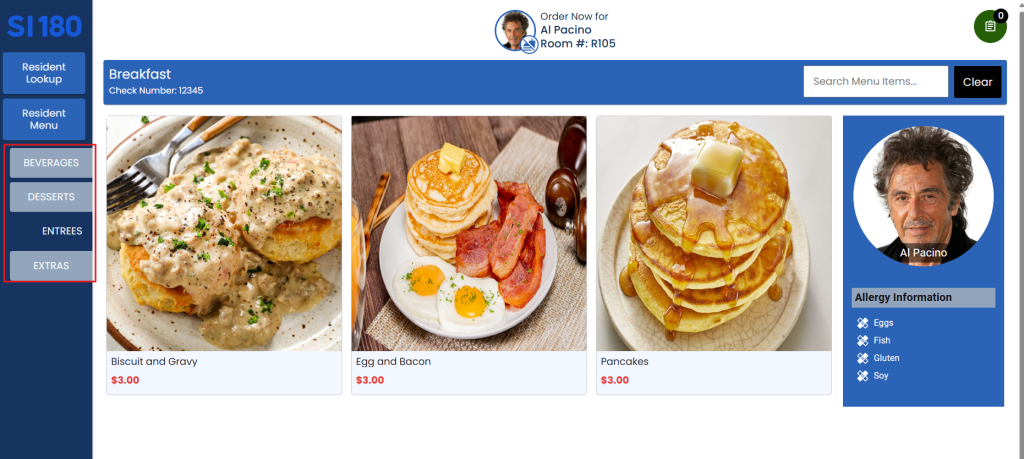 5. Select the items to order from the beverages, entrees, desserts, and/or extras options.