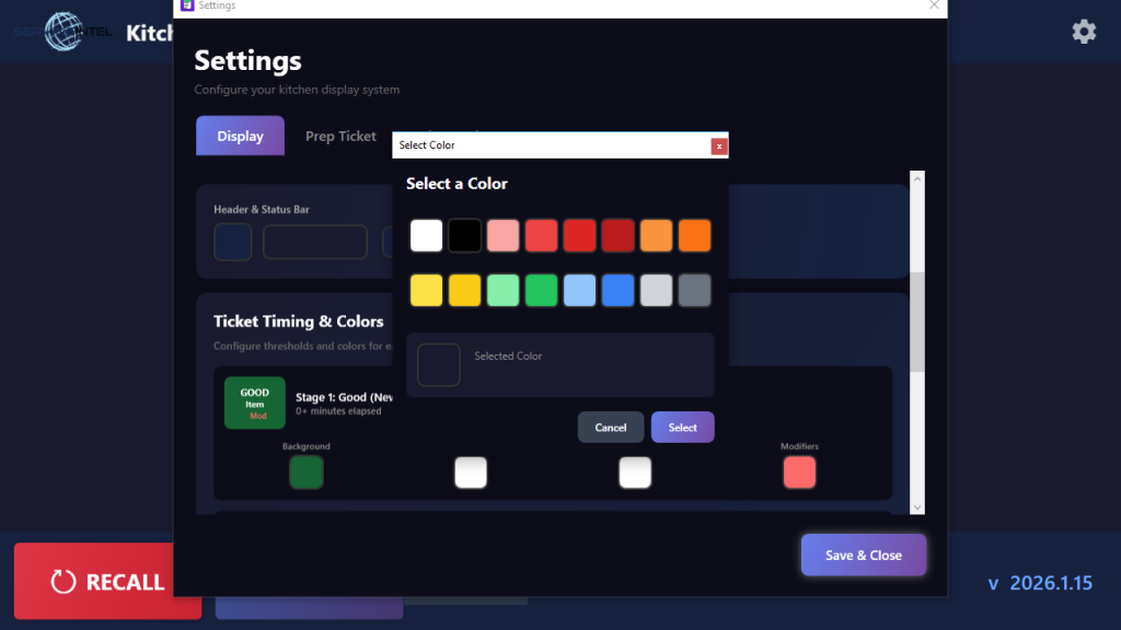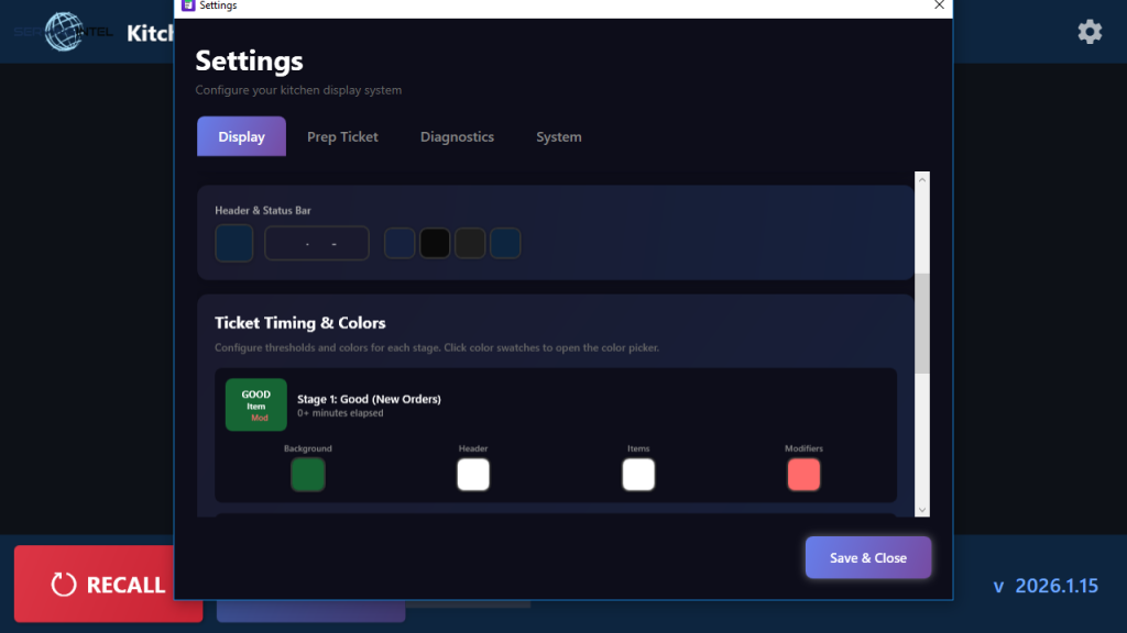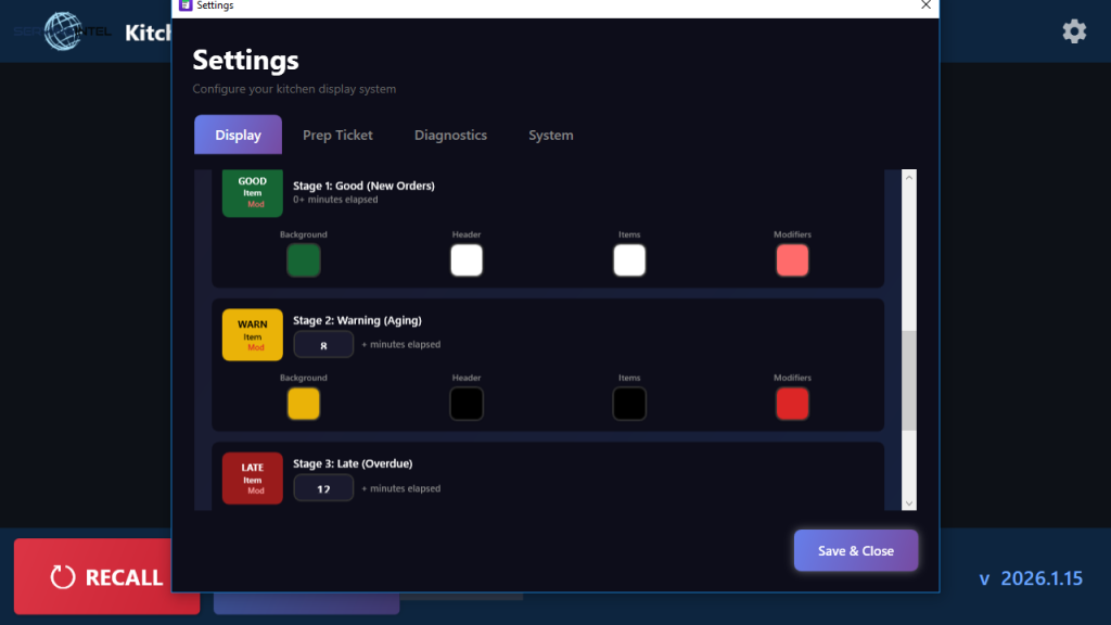SI-KDS allows configuration of ticket aging using color-coded stages.