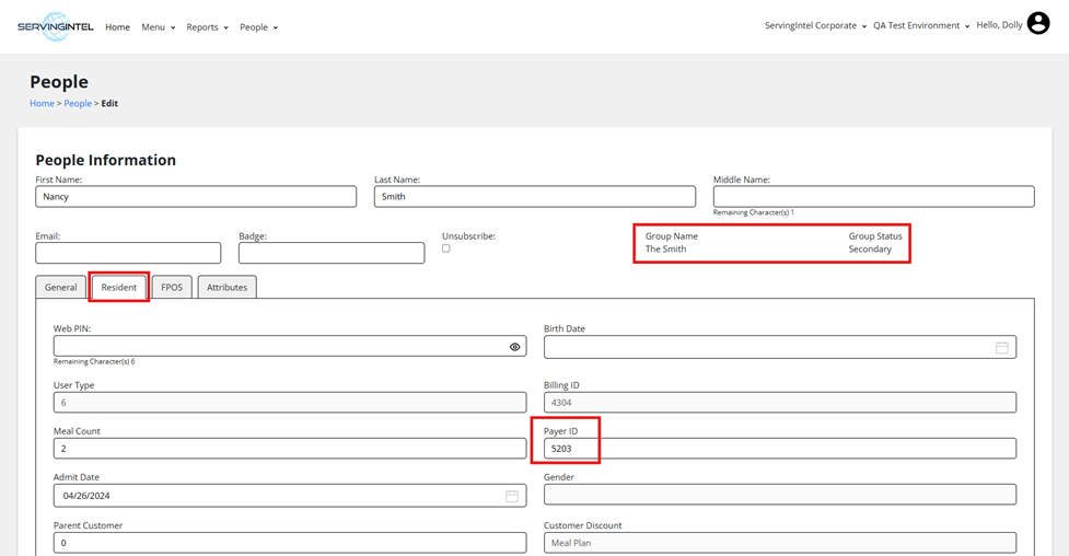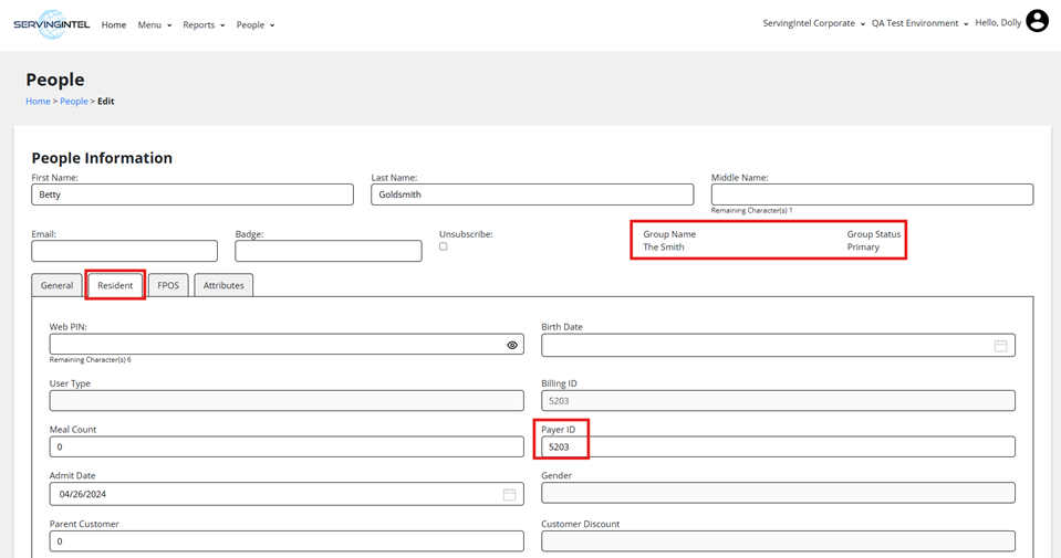 10. Go to the “Resident” tab. The “Group Name,” “Group Status,” and “Payer ID” should reflect the correct info.